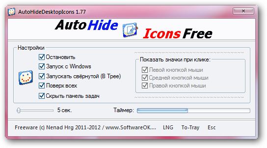 AutoHideDesktopIcons - небольшая и простая в использовании утилита, позволяющая скрывать и отображать иконки на рабочем столе с помощью жестов мыши - клика одной из кнопок по любому свободному месту рабочего стола. Кроме этого, в AutoHideDesktopIcons имеется возможность автоматического скрытия/показа панели задач и иконок, находящихся на рабочем столе, по таймеру.