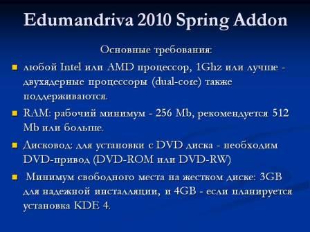 Образовательный дистрибутив на основе Mandriva Linux 2010. EduMandriva 2010 Spring LXDE CD - "легкий" LiveCD на основе LXDE. Удобен для опробования Линукс, установке на слабые машины и как основа для развертывания классов.