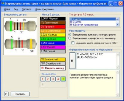 RC-color - это программа для определение параметров резисторов и конденсаторов по их цветовой маркировке (3 - 6 цветных полосок или точек) с автоматической проверкой достоверности полученных результатов по таблицам групп допуска.