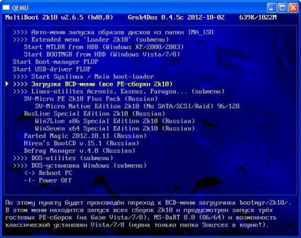 Загрузочный диск базируется на загрузчиках BOOTMGR, Isolinux/Syslinux v.4.06 и Grub4Dos v.0.4.5c. Диск состоит из большого количества продуктов Acronis, Paragon и т.д., с возмoжностью загрузки c CD, USB Flash Drive, USB-HDD и обычного HDD.