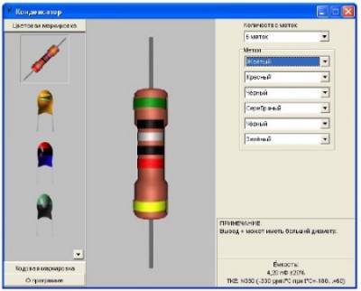 Программа "Конденсатор" предназначена для определения ёмкости конденсатора по разным маркировкам. На данный момент доступна только цветовая маркировка, включающая в себя 12 типов конденсаторов.