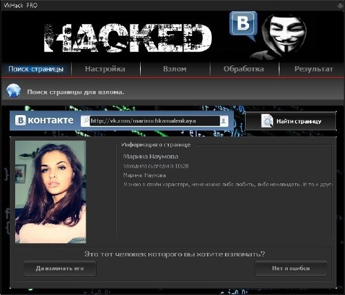 VKontakte hack 296 - софт позволяет подобрать логин и пароль к любой странице социальной сети vkontakte, но при этом Вас на этой странице никто не заметит!!! От Вас всего лишь требуется вставить в программку ссылку на профиль пользователя (т.е. выбрать жертву).